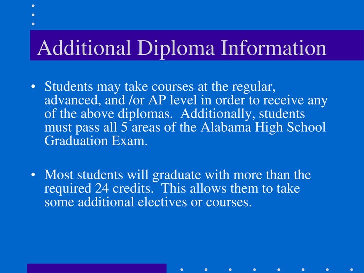 ALABAMA HIGH SCHOOL GRADUATION REQUIREMENTS (Alabama Administrative Code 290-3-1-02(8) and (8)(a)) Effective for students in the ninth grade in the 2013-2014 school year, all students shall earn the required credits for the Alabama High School Diploma. ... Access Doc